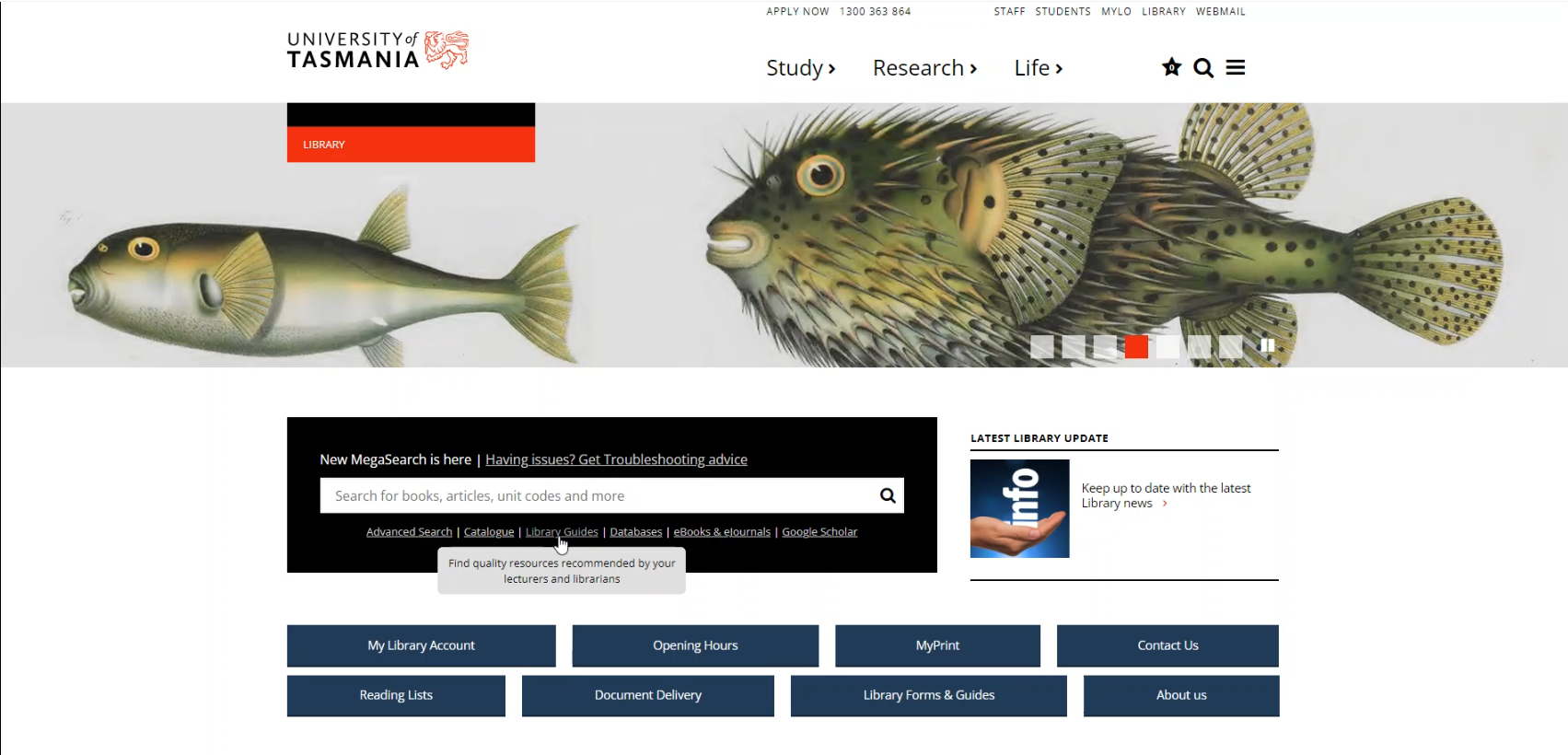 You will find books and ebooks using the University of Tasmania Library catalogue located on the library homepage (no sound).